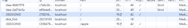 위 사진과 같이 컨텍스트 path값이 다르다. 즉 webapps 하위 경로에 있는 디렉토리 별로 서블릿 컨텍스트가 할당되는 것이다. 브라우저는 기본적으로 sessionId에 대한 쿠키 값의 path를 지정할 때 서블릿 컨텍스트의 컨텍스트 path 값으로 지정한다. 아래 사진은 브라우저의 콘솔창에서 확인한 쿠키 정보이다. 보는 바와 같이 sessionId의 쿠키 경로에 컨텍스트 path값이 들어가 있다.