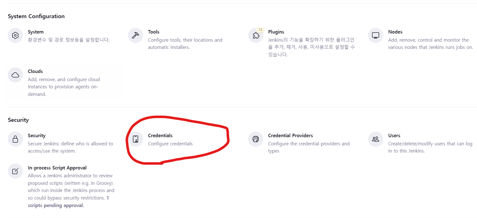 jenkins plugin을 설치할 때 권장항목으로 설치했다면 해당 plugin이 설치되어 정상적으로 메뉴가 있을 것이다. 안 보인다면 Credential Plugin을 설치하면 된다.