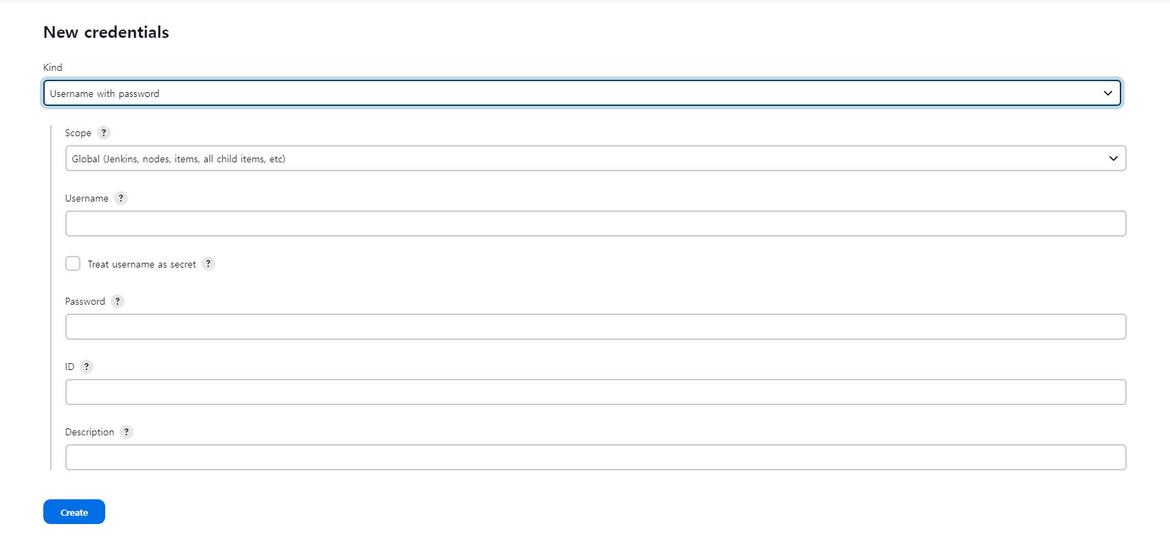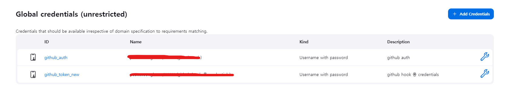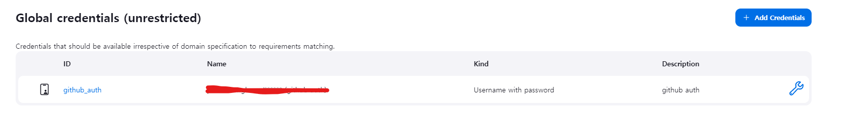 - Scope: 생성하는 credentials를 사용할 수 있는 범위를 말한다. 범위를 제한하지 않는다면 Global을 지정한다.