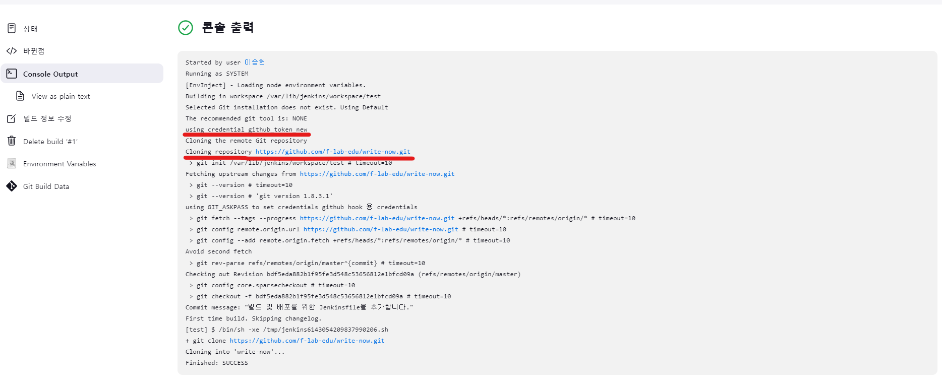 빨간색 줄 쳐진 곳을 보면 지정한 credential을 이용하여 clone을 진행하는 것을 알 수 있다.