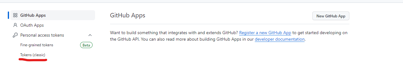 왼쪽 메뉴 바에서 Personal access tokens를 클릭하면 Tokens(classic)이 보인다. 해당 탭을 클릭한다.