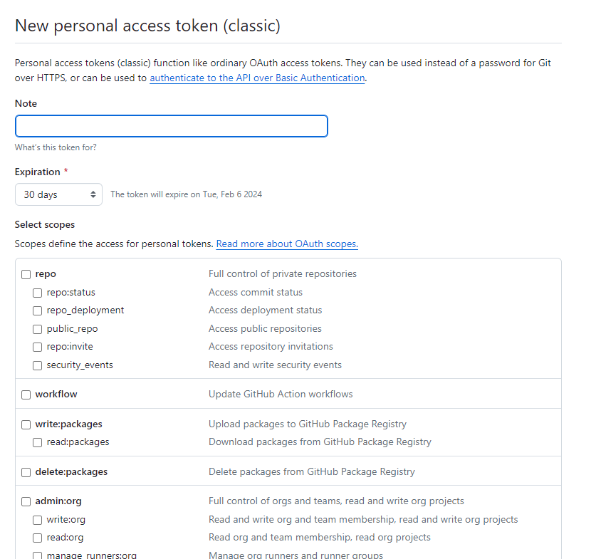 Note, Expiration은 적절히 값을 입력하고 token으로 할 수 있는 작업에 대해 제한하려면 각 checkbox를 적절히 선택한다. 기본적으로 repository에 대한 clone작업을 하기 위해서 repo를 체크해주고 github webhook을 통해 빌드를 트리거 하기 위해서 admin:repo_hook을 체크해준다.