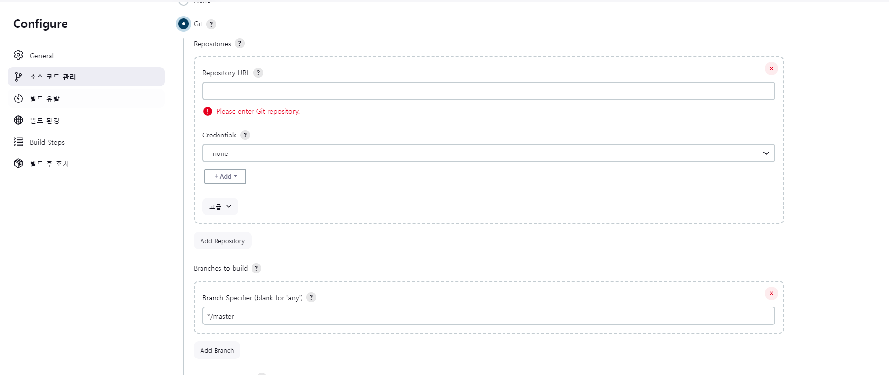 - Branch Specifier: 빌드기준이 될 브랜치를 지정한다.