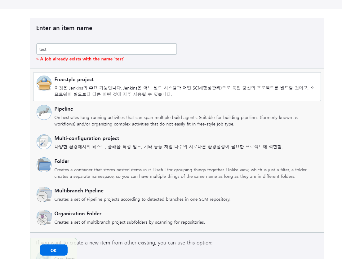 글에서는 확인용으로 사용할 것이므로 간단히 Freestyle project 로 생성할 것이다.