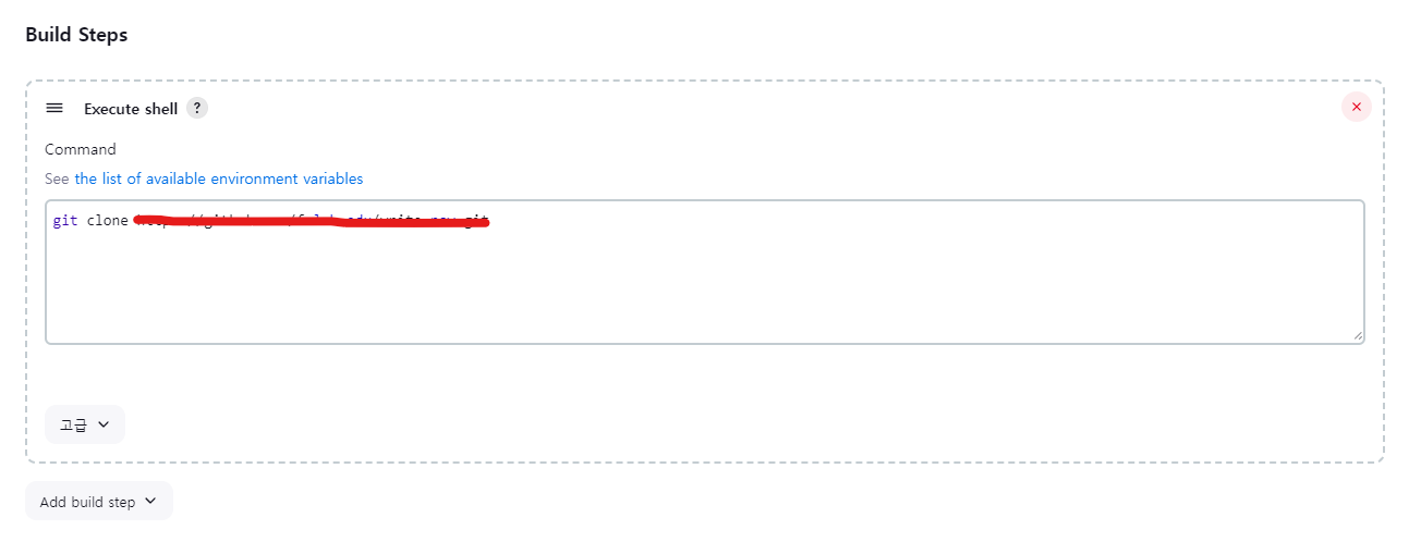 15. Build Steps 부분에서 간단하게 clone 하는 명령어를 작성해주고 저장한다.